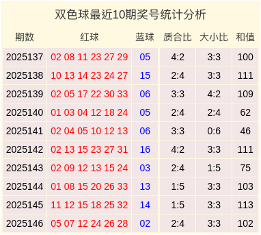 双色球2025146期开奖,本期奖号:红球05、07、12、24、26、28,蓝球02。其中红球奖号质合比为2:4,大小比为3:3,和值为102。