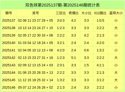 红球大小比为3:3,奇偶比为2:4,012路比为2:2:2,蓝球开出一丝。